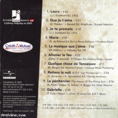 CD PROMO DU CRÉDIT MUTUEL. AVEC POCHETTE 45 TOURS ET LE LIVRET CD de 10 titresTitles, authors and composers1 - Laura..........................................................................................................4'43 (J.J. Goldman)2 - Que je t'aime..............................................................................................3'21 (G. Thibaut / J. Renard)3 - Je te promets.......................................................................................