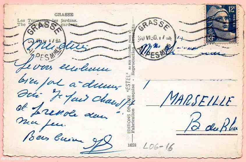 CP noir et blanc papier brillant , GRASSE Les terrasses, les jardins Edition "ESTEL" Paris N°1658Timbre MARIANNE DE GANDON 12F Outremer, Tarif Carte Postale Interieur du 6-01-1949Couronne Dept : ALPES MmesRef Yvert GRA606 KragAdresse masquée informatiquementMaref : FL06-16