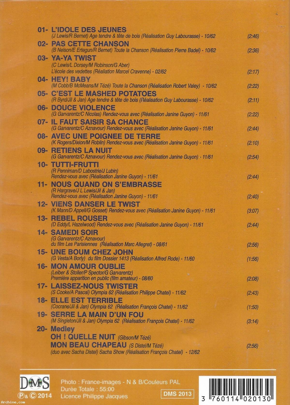 3 TITRES DE CHARLES AZNAVOUR. 1 TIRE DE SACHA DISTELDVD de 20 titresTitles, authors and composers1 - L'idole des jeunes (Age tendre & tête de bois) 10/62     (J. Lewis / R. Bernet)...............................................................................(2:46)2 - Pas cette chanson (Toute la chanson) 10/62     (B. Nelson / E. Ertegun / R. Bernet)........................................................(2:36)3 - Ya-ya twist (L'école des vedettes) 02/62     (C. Lewis / L. Dorsey...